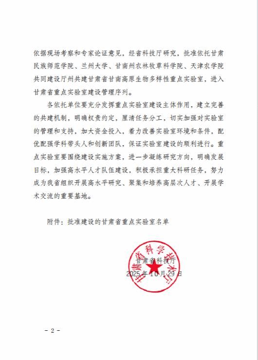 近日,从甘肃省科技厅获悉,yabo鸭脖参与共同建设的厅州共建甘肃省甘南高原生物多样性重点实验室获甘肃省科技厅批准建设,并纳入甘肃省重点实验室建设管理序列,标志着yabo鸭脖省部级重点实验室建设取得了新的突破。