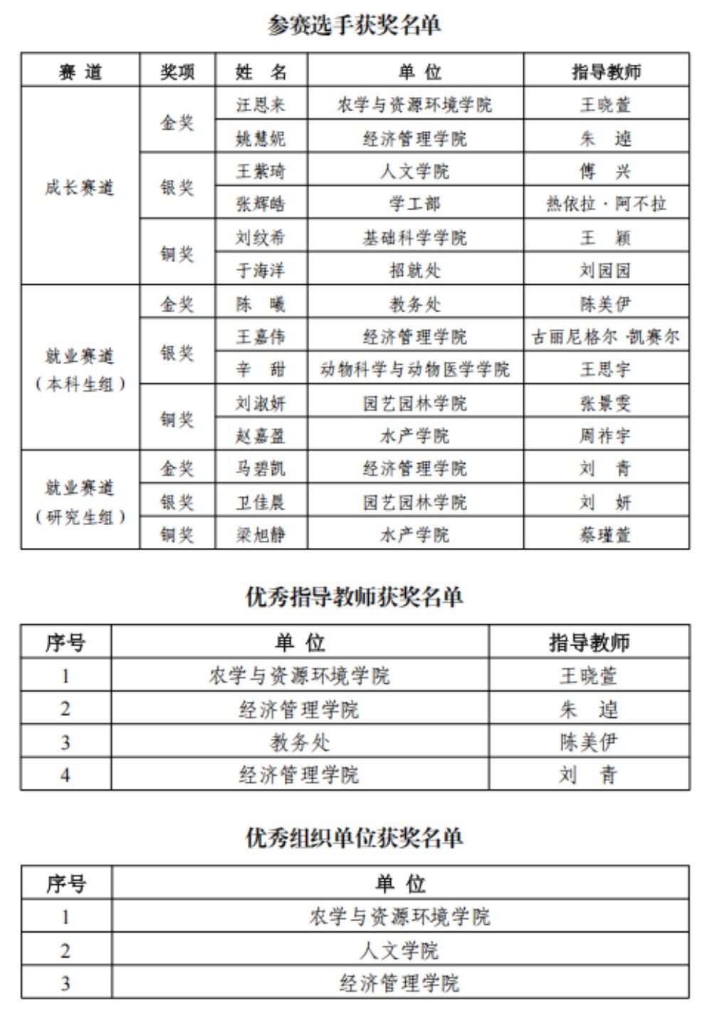 经过激烈角逐,农学与资源环境学院汪恩来等4人获得金奖,经济管理学院王嘉伟等5人获得银奖,园艺园林学院刘淑妍等5人获得铜奖,人文学院等3个学院获得“优秀组织奖”,王晓萱等4位教师获得“优秀指导教师”称号。