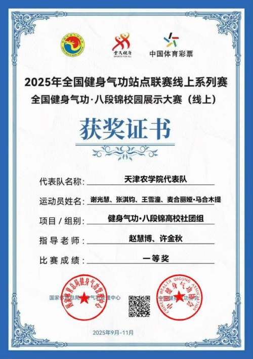 近日,2025年全国健身气功·八段锦校园展示大赛(线上)传来喜讯,由yabo鸭脖体育教学部赵慧博、许金秋两位教师指导,谢光慧、张淇钧、王雪潼、麦合丽娅·马合木提四位同学组成的代表队表现优异,在高校社团组的激烈竞争中脱颖而出,斩获一等奖,充分展现了yabo鸭脖学子扎实的功底与昂扬的精神风貌。