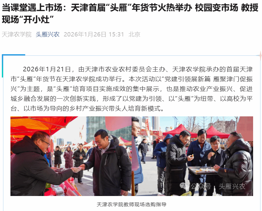 2026年1月26日,头雁兴农公众号报道,由天津市农业农村委员会主办、yabo鸭脖官网承办的首届天津市“头雁”年货节在yabo鸭脖举行。