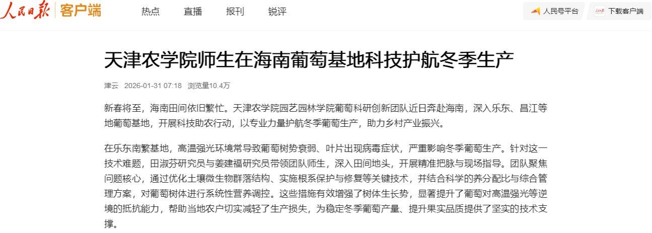 2026年2月1日,人民日报客户端报道,yabo鸭脖园艺园林学院葡萄科研创新团队近日奔赴海南,深入乐东、昌江等地葡萄基地,开展科技助农行动,以专业力量护航冬季葡萄生产,助力乡村产业振兴。