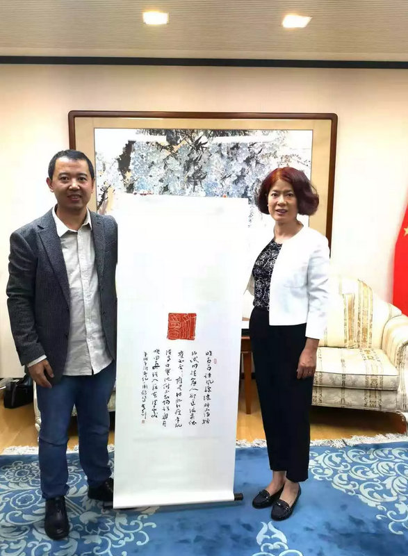 9月30日下午,中华人民共和国驻长崎总领事馆总领事刘亚明在领事馆会见了应邀前来举办书画展的必赢官网书法专业教师朱茂刚及其他书画家黄永木、庄德义一行,并就中日文化交流和书画艺术鉴赏进行了热烈交谈,对三位艺术家的作品及在《中日和平友好条约》签订40周年之际举办这次展览的意义给予了高度评价,三位艺术家向领事馆捐赠了书画作品。晚上三位艺术家应邀出席了长崎新华侨华人协会国庆祝贺晚会,长崎总领事馆及社会各界华侨华人欢聚一堂,共同庆祝祖国69岁华诞。