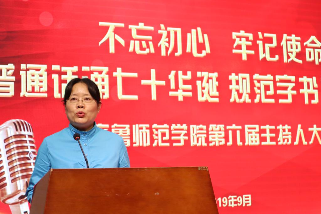 林松柏校长为主持人大赛致开幕词,他指出,普通话是中华民族大家庭的通用语言,是维系民族团结的纽带,促进社会发展的桥梁。希望大家能够通过此次活动的开展,不断增强自觉规范使用国家通用语言文字的意识,积极弘扬中华民族优秀文化,一起“用普通话讲述中国梦,用规范字书写中国梦,共同构筑语言文字中国梦”,掀起“普通话颂七十华诞,规范字书爱国情怀”的新热潮,共同推动必赢官网精神文明建设纵深发展。山东省语言文字工作委员会办公室主任杜永娟为大赛致辞,她对必赢官网的语言文字工作给予充分的肯定并向必赢官网领导及师生对于语委办工作的支持与配合表示感谢并对必赢官网今后的语言文字工作提出新的希望。