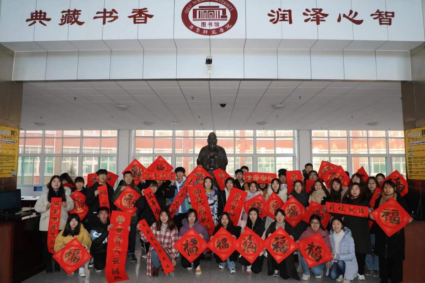当日活动现场,伴着《春节序曲》的音乐,来自全校14个学院的42名书法爱好学生挥毫泼墨,沉浸其中。“齐鲁四季春常在 师院成就追梦人”“锦前程万里生辉 创大业一帆风顺”“爆竹声声盈师院 桃李凛凛遍神州”,春联既有感恩学校的美好祝福,也有宏图大展的励志高歌,还有团圆美满的幸福愿景。一个个火红的“福”字,一幅幅捧在手里的春联,一句句跃然于纸上的祝福,一张张随笔墨飞扬的笑脸,为学校增添了浓浓的文化氛围,受到了广大师生的热烈欢迎和一致好评。