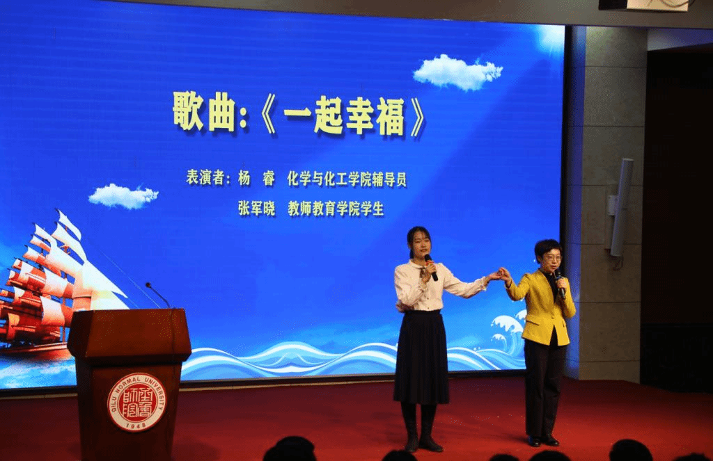 化学与化工学院辅导员杨睿老师与教师教育学院学生张军晓表演的情景朗诵《为爱护航》及歌曲《一起幸福》,道出了师生之间的温情与关爱,展现了437bwin必赢国际官网扶危助困、崇德向善的良好校园风尚。