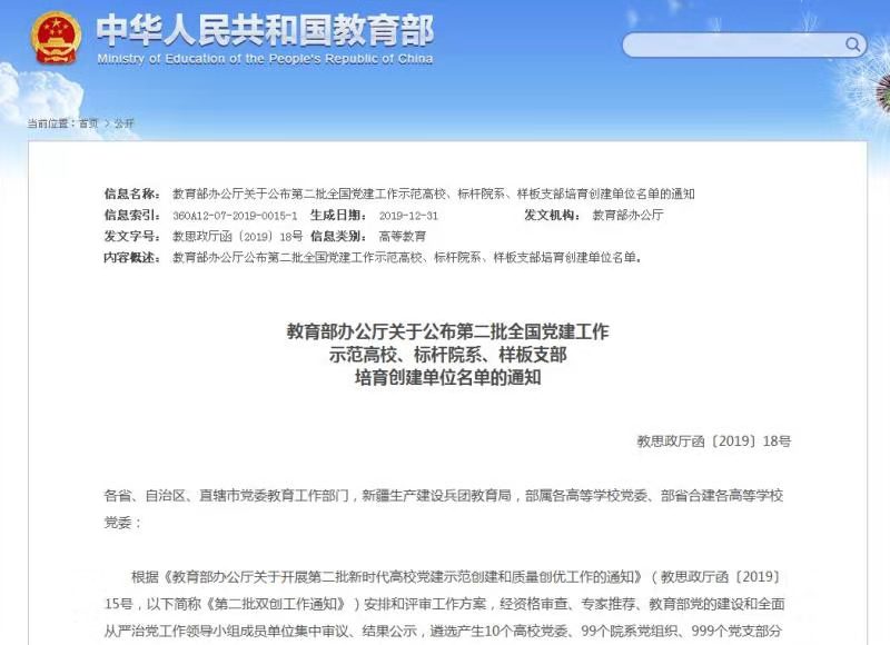 近日,《教育部办公厅关于公布第二批全国党建工作示范高校、标杆院系、样板支部培育创建单位名单的通知》(教思政厅函〔2019〕18号)在教育部官网发布。必赢官网体育学院教师第二党支部光荣入选“全国党建工作样板支部”培育创建单位。这是必赢官网高质量开展“不忘初心、牢记使命”主题教育的一个成果,更是教育部对必赢官网党建和思政工作的充分肯定。