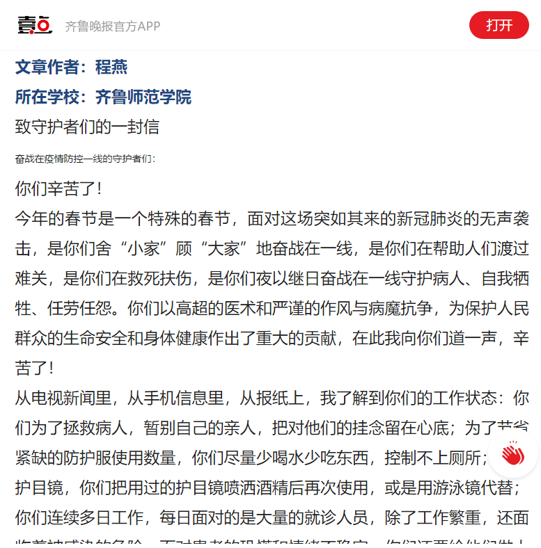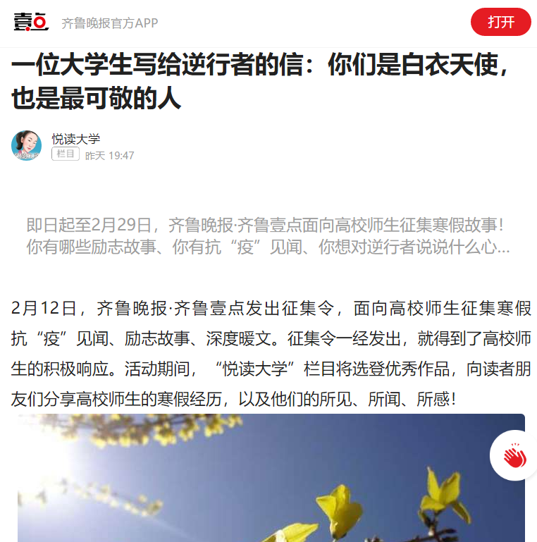 当齐鲁晚报·齐鲁壹点发出征集令,面向高校师生征集寒假抗“疫”见闻、励志故事、深度暖文。征集令一经发出,就得到了必赢官网师生的积极响应。齐鲁晚报·齐鲁壹点“悦读大学”栏目采用了必赢官网部分优秀作品,现予以转登。