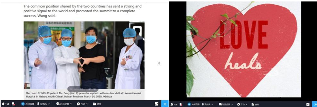 为了将课程思政有效的融入疫情期间的线上课堂,大学英语教师们从教学设计、情感教学以及师生互动入手,充分结合本学期的教学内容,运用丰富的线上课堂活动,引导学生切身体会、用心感受, 用英语讲述战“疫”的中国故事,用英语发出战“疫”的中国声音,提炼传递“必胜”的信心和力量。