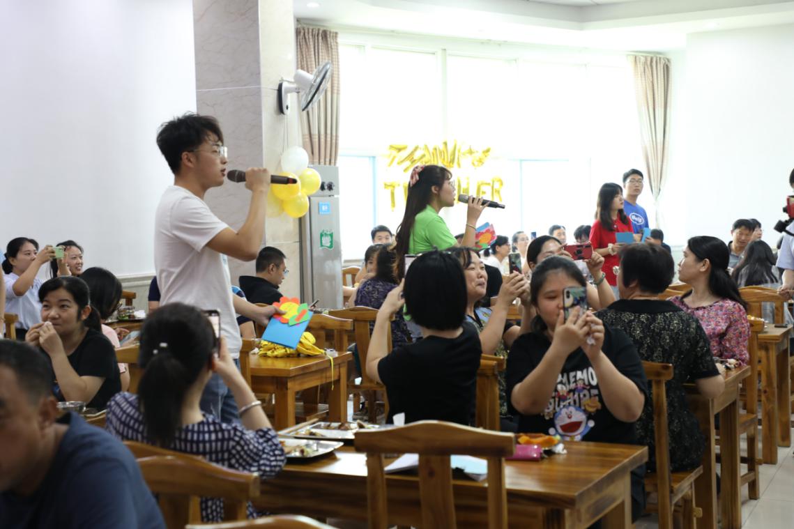 10日中午,最先走进教职工餐厅的老师脸上露出些许惊喜,“HAPPY TEACHER'S DAY”“祝老师教师节快乐!”鲜亮的彩色气球将餐厅装扮一新,更添活力与温情。“老师,祝您节日快乐!”紧接着,餐厅两侧大银幕上播放的街采视频令老师们再添笑意。惊喜一重接一重。到了中午11点40分,伴随着“叮叮叮叮……”的音乐声,原本寂静的教职工餐厅里突然热闹起来。十几名青年学生快速有序进入餐厅,悠扬的音乐声缓缓流淌,“你放开双手,让我遨游知识的海洋……”“老师啊是我学习的榜样,你给我的一切我永远不会忘。”老师们从最初的不明所以,瞬间转化为惊喜和欢笑,纷纷举起手机记录下这一难忘时刻。一曲舒缓的《老师》唱罢,《致亲爱的老师》让气氛愈加热烈,“太阳当空照,花儿对我笑。”歌伴舞《重返十七岁》更是将现场气氛推向高点,青春洋溢的舞台感染着现场每一位观众,不少老师站起来跟着节拍合唱、挥手、鼓掌,忘情地融入其中。