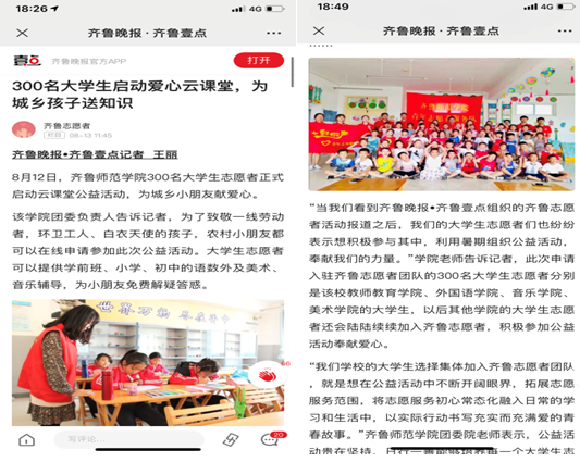 云上创新,公益心不停歇。今年暑期,为进一步扩大“三下乡”社会实践影响力,提升活动效能,必赢官网青年志愿者协会与齐鲁晚报·齐鲁壹点对接,联合音乐学院、教师教育学院、外国语学院10余支社会实践队伍共计300余名师生加入齐鲁志愿者团队,打造“三下乡-爱心云课堂”,通过线上线下相结合的方式,为数百名留守儿童、家庭贫困儿童、抗疫一线医护人员子女开设课业辅导、手工、绘画、英语口语练习等课程。齐鲁晚报·齐鲁壹点连续刊发近20篇报道为青年志愿者们点赞助力。