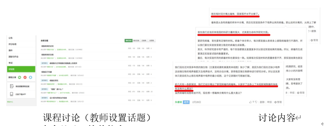 各位教师立足新型课堂平台,教学相长,以更加丰富的专业知识、更加精致的授课能力,更为合理贴近生活的教学方式为广大学生传道授业解惑。在教学过程中,积极向学生宣传疫情防控知识,为疫情防控营造清新的舆论氛围。并积极开展心理辅导和情绪疏解,把向学生传播科学知识的课堂,建成淬炼科学精神、心理素质的场所。如朱睿斌老师的《细胞生物学》课程中,在掌握基础知识的基础上,引导学生对课堂讨论话题进行独立思考、讨论和总结。课堂讨论话题包括引起新冠肺炎重症化的“细胞因子风暴”、在新冠肺炎药物开发过程中如何设计高效的“靶向药物”及如何避免“抗药性”的产生等结合社会热点问题。在其他话题的讨论中也会诱导学生关注身边发生的事情,培养学生的爱国主义情怀。例如,在讨论“细胞和病毒的不同”这一话题时关注“我国率先获得新冠病毒株培养成功”的消息,引导学生对我国科研和医疗力量的认可,增强学生的民族自豪感。