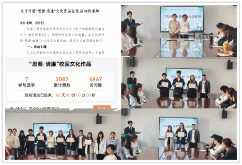 “思源·清廉”校园文化作品征集、颁奖。学院前期精心组织并开展了“思源·清廉”校园文化作品征集活动,自征集活动启动以来,吸引了师生们踊跃参与,经过初选,共有七项优秀作品脱颖而出,通过线上线下投票评比,最终,评选出一等奖1项、二等奖2项、三等奖4项。11月3日,学院纪委委员刘燕老师、李顺勤老师为获奖选手颁发了荣誉证书。