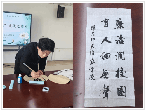 “执笔写清廉,书法话清廉”。活动现场,2022级食科3班侯启轩同学,现场挥毫泼墨,书写了“廉洁润校园、育人细无声”“思源·清廉”等书法作品,笔墨游走间流淌出墨香廉韵,一撇一捺展现出了崇廉尚洁的精神追求。