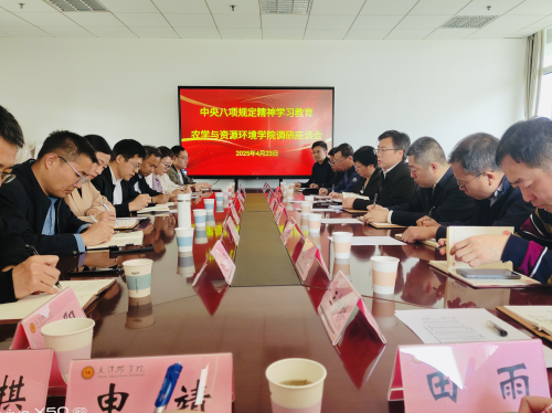 为推动深入贯彻中央八项规定精神学习教育走深走实,4月23日,校党委书记李鑫带头“四下基层”,深入农学与资源环境学院,与学院领导班子成员和师生代表座谈交流,调研学院深入贯彻中央八项规定精神学习教育和推动就业情况,征求师生对党员、干部贯彻中央八项规定及其实施细则精神的意见建议,了解师生急难愁盼和亟待解决的问题。